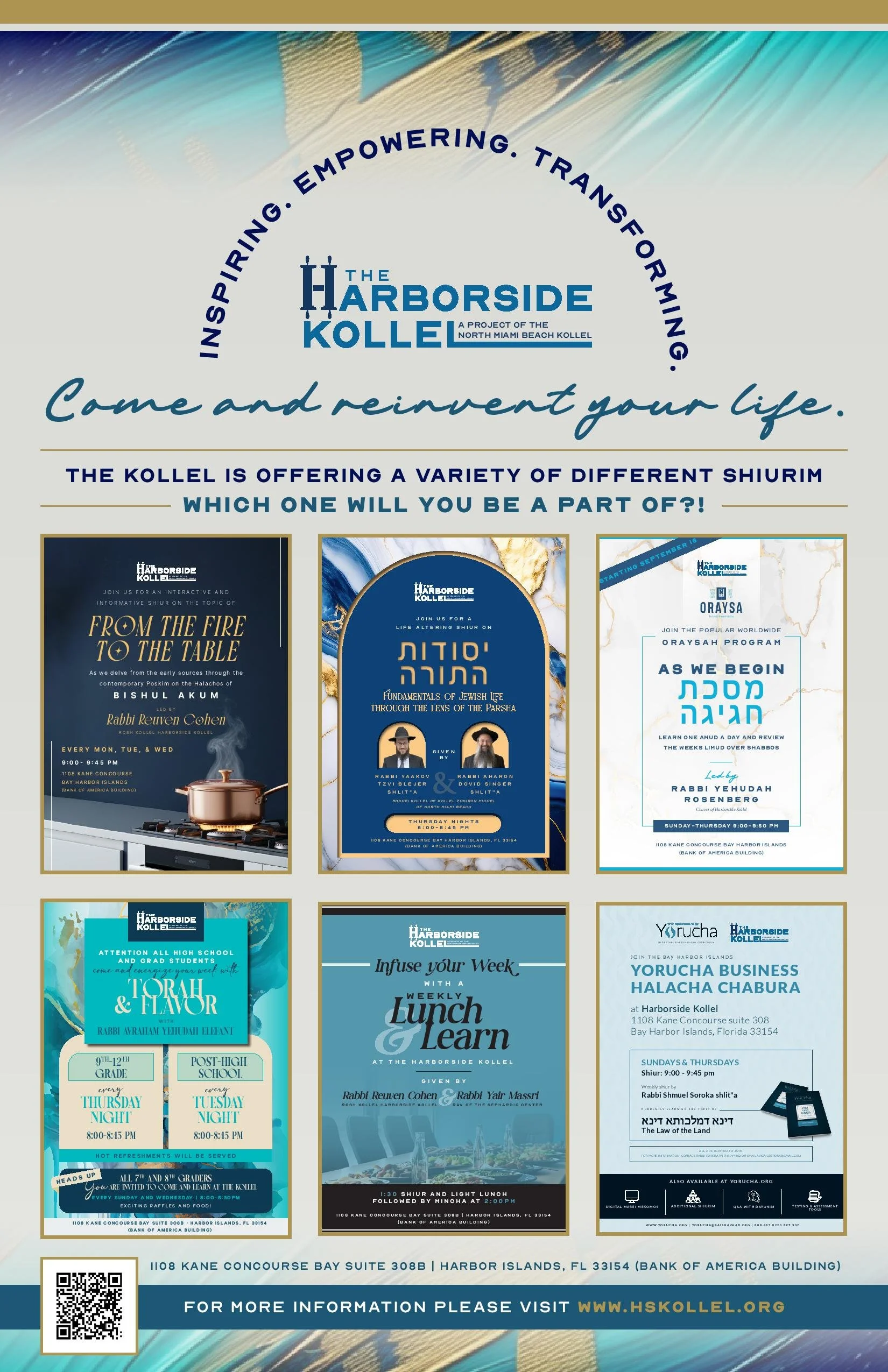 The Harborside Kollel is an exciting new initiative born from the collaboration between passionate local families in Bal Harbour, Bay Harbour and Surfisde and the esteemed North Miami Beach Kollel. Under the leadership of Rabbi Reuven Cohen - renowned educator, dynamic speaker, and director of community outreach for the NMB Kollel, the Harborside Kollel is poised to infuse the community with a spirit of growth, connection, and Torah vitality.